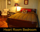Light pine green in color, The Heart Room is romantic in décor. Period artwork, needlepoint, and an 1800’s mirrored dresser which belonged to the innkeeper’s great grandparents, are fitting in this Victorian bedroom. A desk handcrafted by Wesley allows for old-fashioned letter writing or necessary paperwork.