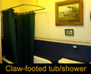 Throughout the 1988 restoration of The Carriage House, this room was referred to as “The Savannah Room”. Much of the decor was collected over the years in Savannah, Georgia, including a great architectural transom and the feet on the claw footed tub. The Savanah room is masculine with indigo blue walls and earthtone paisley wallpaper. Audubon prints, along with clipper and other pleasant old artwork hang within.